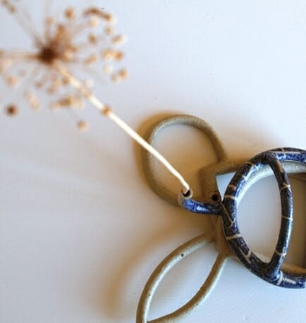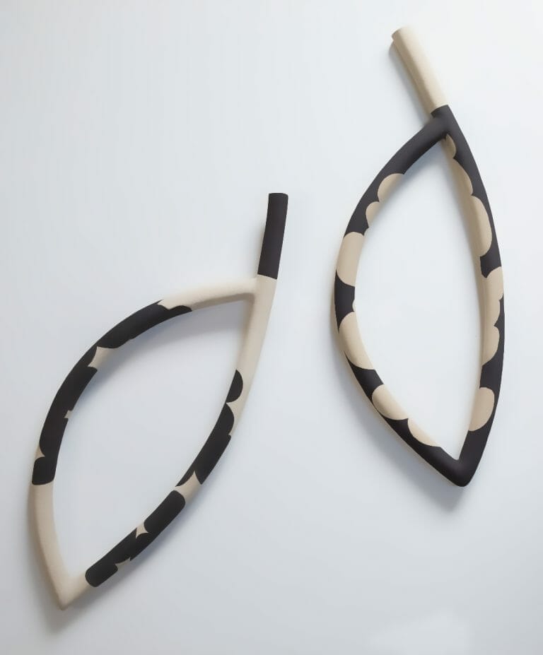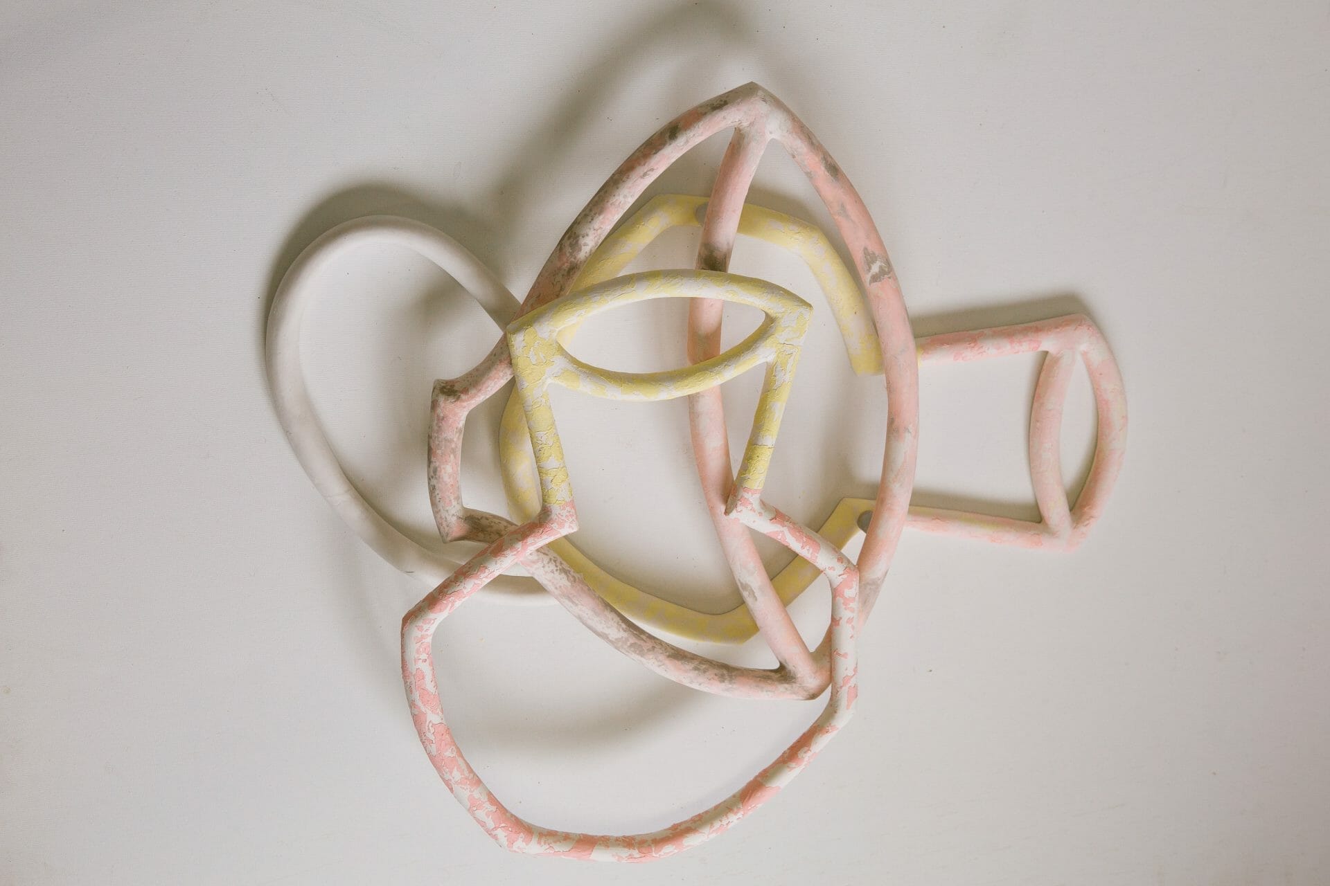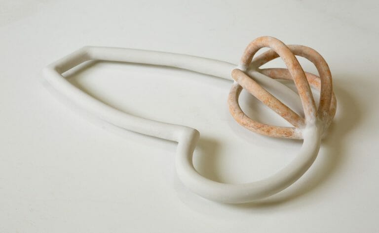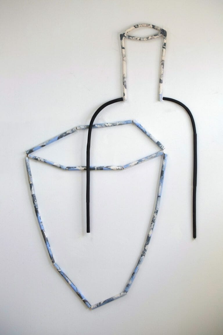 Papadopoulou's ceramic language has evolved to a rarefied condition in which all that remains are the lines and contours, which demarcate the empty spaces confined in them. The artist uses the traditional clay lampstand not to construct a compact vessel, but to create the outline of its form. Using high-fired clay, he molds hollow, thin tubes with which to create new shapes. These aerial figures are positioned, freely suspended in space, so as to trace their path; they give the impression that they can expand in the room. This aerial, light and floating construction represents the human desire to overcome the difficulties of the body, weighed down by gravity, to a more spiritual level.